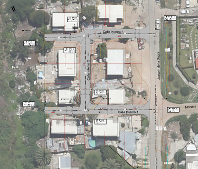 Proyecto ejecutivo de la infraestructura vial. Incluyó diseño de la planimetría de las calles, altimetría, definición de intersecciones y definición de pavimentos.